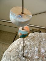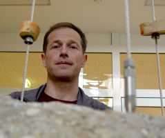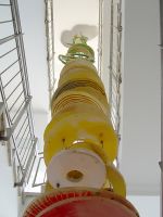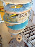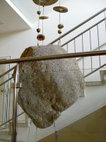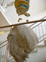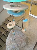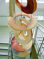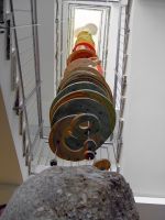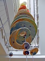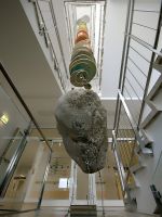 Dass alles mit allem zusammenhängt, ergibt sich durch die konkrete Umsetzung des Grundgedankens: Vom Plafond abwärts hängen die Holzscheiben und vier auf den Stockwerksebenen eingeschobene Zwischenebenen aus Metall über 17,4 m an Edelstahlseilen, die im Basisstein verankert sind.